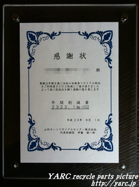 ちなみに写真の楯のお客様は自動車中古パーツを使用することにより、年間2323KgのCO2の削減に貢献していただきました。