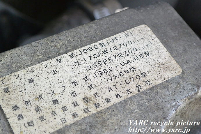 エンジン型式はJ08C-T(JT-Ⅳ 235PS インタークーラーターボ)、6速フロアマニュアルミッション です。この車両は海外向けの車両として、第二の人生を海外で再利用されることになります。